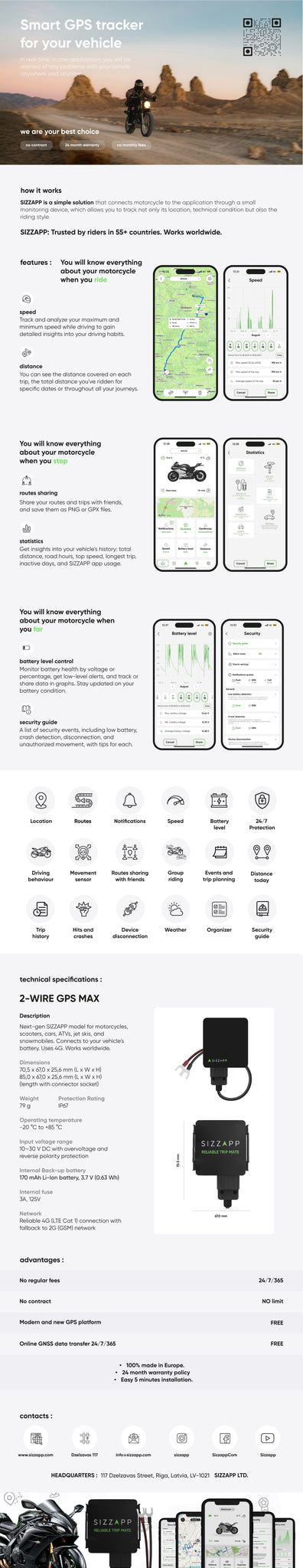 SIZZAPP is a plug-and-play GPS tracker that connects directly to the vehicles battery and links via a bespoke APP to the rider’s smartphone.